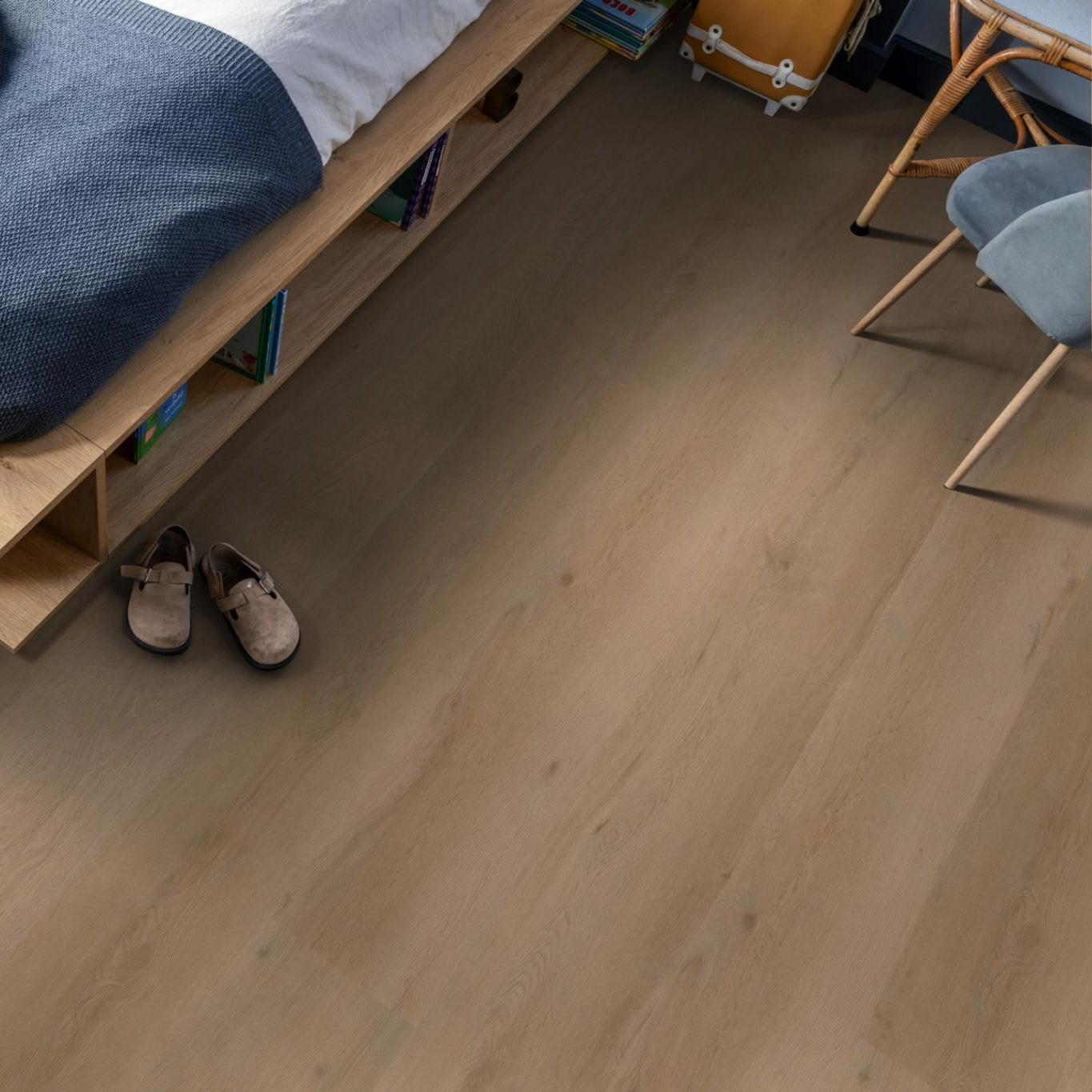 Dankzij de Dryback-installatie ligt de vloer strak en stabiel. Bovendien is hij slijtvast, geluiddempend en geschikt voor vloerverwarming. Ook in ruimtes zoals de keuken of hal komt deze waterbestendige vloer uitstekend tot zijn recht.