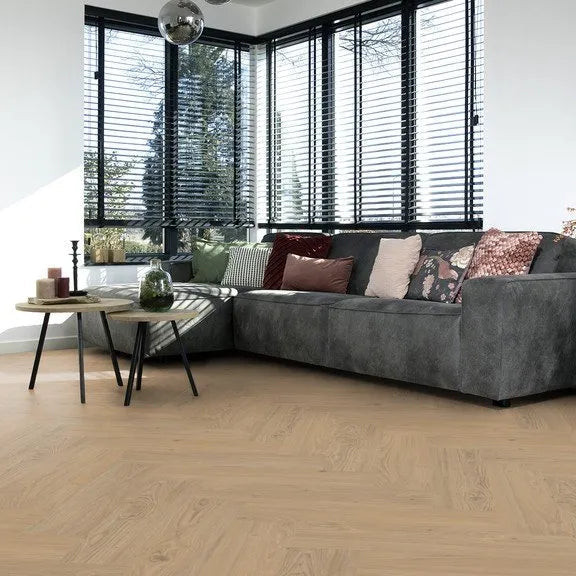 Breng tijdloze elegantie in huis met de Douwes Dekker Ambitieus Creme Brulee Dryback Visgraatvloer. Deze hoogwaardige plak-PVC vloer combineert de warme uitstraling van natuurlijk eikenhout met het moderne gemak van een duurzame, onderhoudsvriendelijke afwerking. Het verfijnde visgraatpatroon geeft elke ruimte een luxe en stijlvolle uitstraling – ideaal voor zowel klassieke als moderne interieurs.