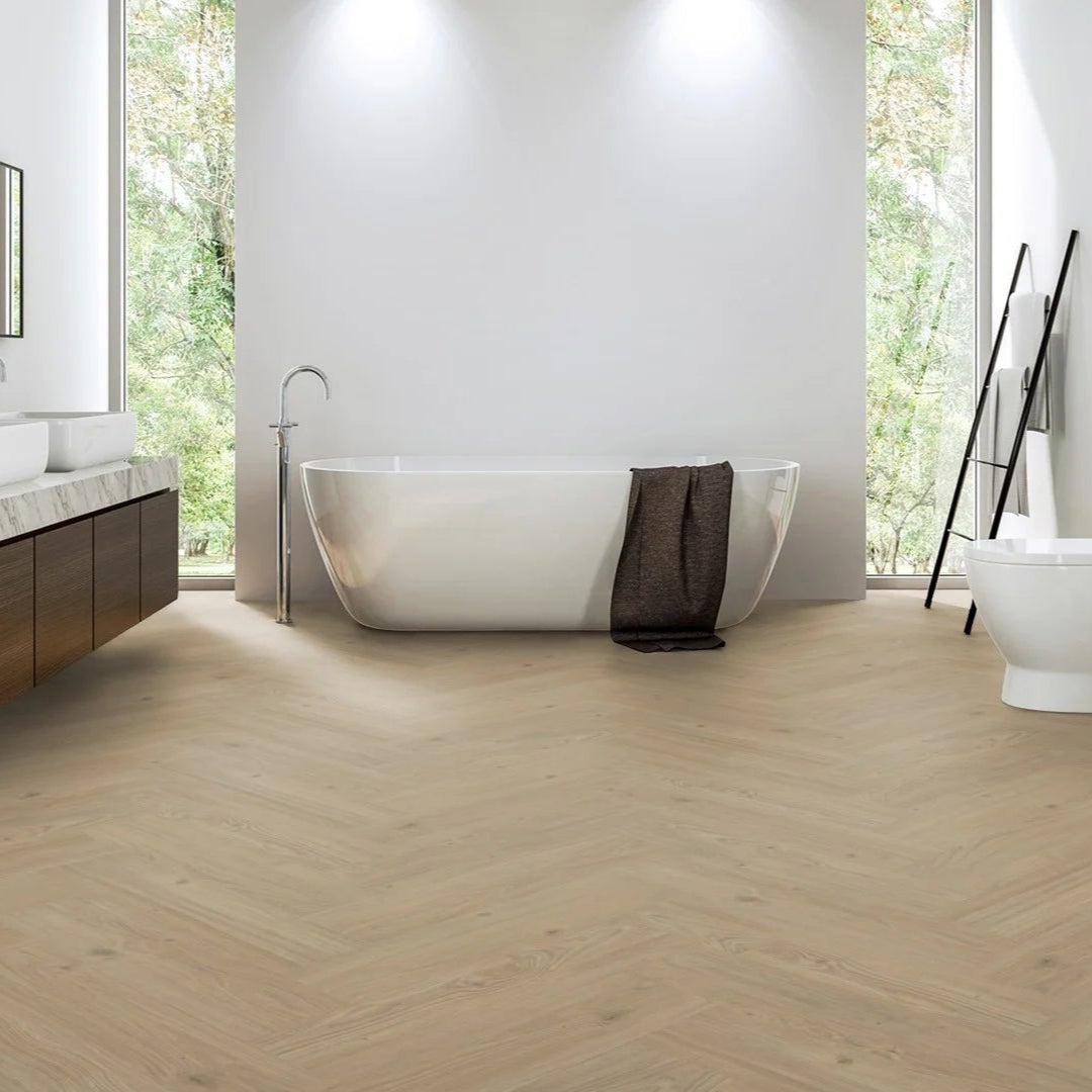 Breng tijdloze elegantie in huis met de Douwes Dekker Ambitieus Panna Cotta Dryback Visgraatvloer. Deze hoogwaardige plak-PVC vloer combineert de warme uitstraling van natuurlijk eikenhout met het moderne gemak van een duurzame, onderhoudsvriendelijke afwerking. Het verfijnde visgraatpatroon geeft elke ruimte een luxe en stijlvolle uitstraling – ideaal voor zowel klassieke als moderne interieurs.
